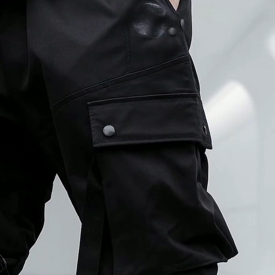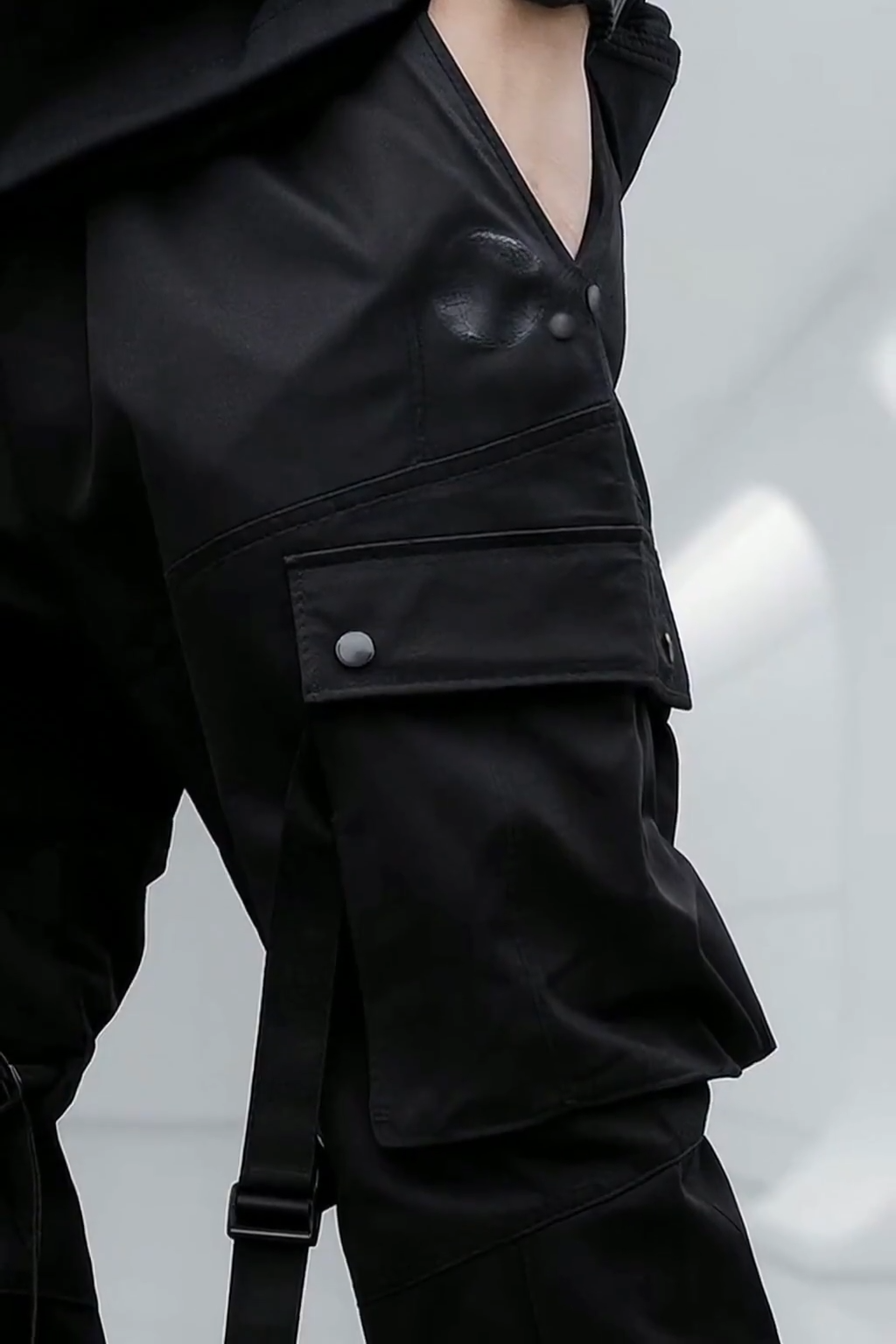 Constructed from reinforced polyester, these joggers balance flexibility with structure. Multiple tactical pocket zones keep gear close and accessible, while the smooth matte surface and streamlined taper deliver an unmistakable techwear silhouette.